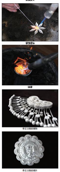 图1:银饰焊接 图2:熔银 图3:李正文做的银饰 图4:李正文做的银片