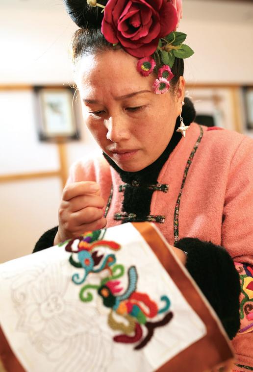 我的女儿11岁了,正在读书。她回家的时候我也想让她绣一点花,她就是一有空就去做一点,而且她说现在很多小孩子是玩儿手机啊,玩儿电脑这些,我一开,我就问她你作业做了没有?你绣一点花吧。她说妈妈你让我放松一点,那你拿来,我会绣就行了,如果一定要绣好、绣成我绣不成,反正一些东西简单的她可以绣,如果绣太多她也没时间绣,我也不想去强迫我的女儿。我也希望她走出去,我觉得做刺绣这个行业,只能维持一下自己一个女人的事情,不是很光荣的事。而且很辛苦,一个人做也做不那么多,现在我们组织有那么多人,就没文化。没文化,就很吃力,所以目前我挺累的,很累很累,现在我这些产品如果就是说要成一个链条的,从设计、成产、包装一个程序来,每一样都做。