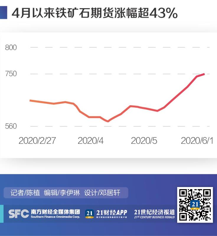 截至6月1日收盘时,铁矿石期货主力合约报在752.5元/吨,盘中一度创下去年8月以来最高点775.5元/吨,这意味着4月以来,铁矿石期货累计涨幅超过43%。