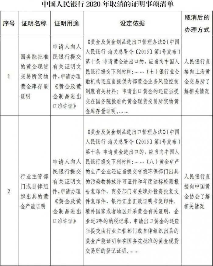 21世纪经济报道记者梳理该取消的证明事项清单发现,该11项证明取消后,办理方式大多改为人民银行直接向相关部门了解情况,或者是央行将通过“互联网+监管”系统直接获得。如央行取消“国务院批准的黄金现货交易所实物黄金库存量证明”后,人民银行将直接向上海黄金交易所了解相关情况。