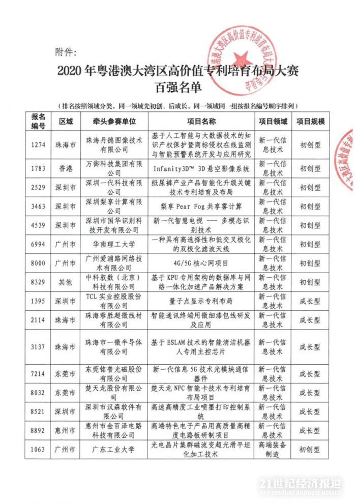 在粤港澳大湾区,有不少类似企业通过布局专利增强了自身的自主创新能力。近日,2020年粤港澳大湾区高价值专利培育布局大赛(下称“湾高赛”)发布百强名单,以立白集团、东阳光制药为代表的企业便位列其中。