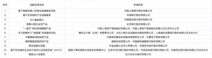 这11个项目分别为工商银行的基于智能机器人的移动金融服务项目;中国银行的基于区块链的产业金融服务;建设银行的5G+智能银行;北京银行的普惠小微企业贷产品;中国人寿和其北京分公司的“一路行”移动终端理赔产品;腾讯云计算(北京)有限责任公司、北京小微企业金融综合服务有限公司、浦发银行北京分行联合申请的多方数据学习“政融通”在线融资项目;中国电信集团系统集成有限责任公司、天翼电子商务有限公司的天翼智能风险监控产品;国网征信有限公司和邮储银行的国网智能图谱风控产品;中金金融认证中心有限公司、民生银行的移动金融云签盾;国家计算机网络与信息安全管理中心、中关村银行、百信银行、民生银行北京分行的基于区块链的企业电子身份认证信息系统(eKYC);拉卡拉支付股份有限公司的智能云小店服务。