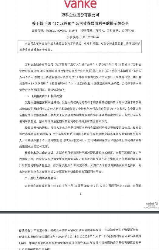 6月1日,万科企业股份有限公司发布公告称,拟下调“17万科01”公司债券票面利率,预计在该债券存续期等后2年,将票面利率由4.5%调整为1.9%。