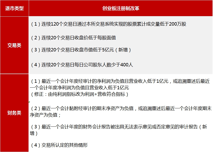 表2:创业板注册制改革有关交易类和财务类的退市规则