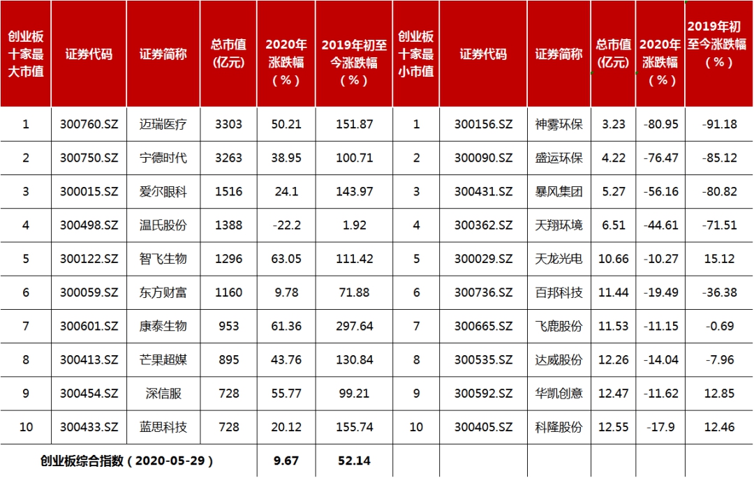 表3:创业板十家最大市值及十家最小市值公司股价表现
