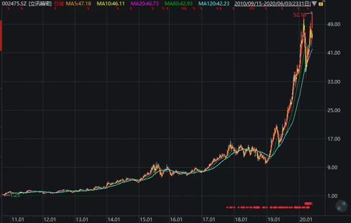 对比2010年发行时的50亿元市值,立讯精密的市值10年上涨了50多倍。