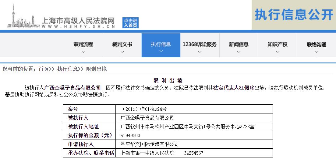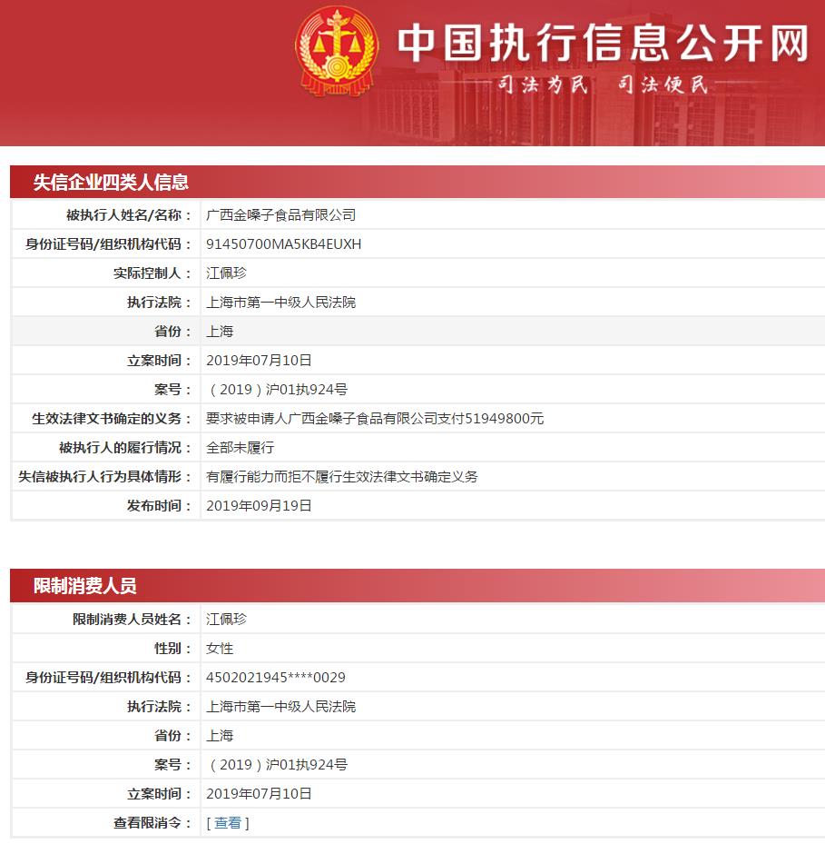 上海市高院称,被执行人广西金嗓子食品有限公司,因不履行法律文书确定的义务,法院已依法限制其法定代表人江佩珍出境。案号为(2019)沪01执924号,执行标的5194.98万元。这则限制出境公告发布于今年5月26日。