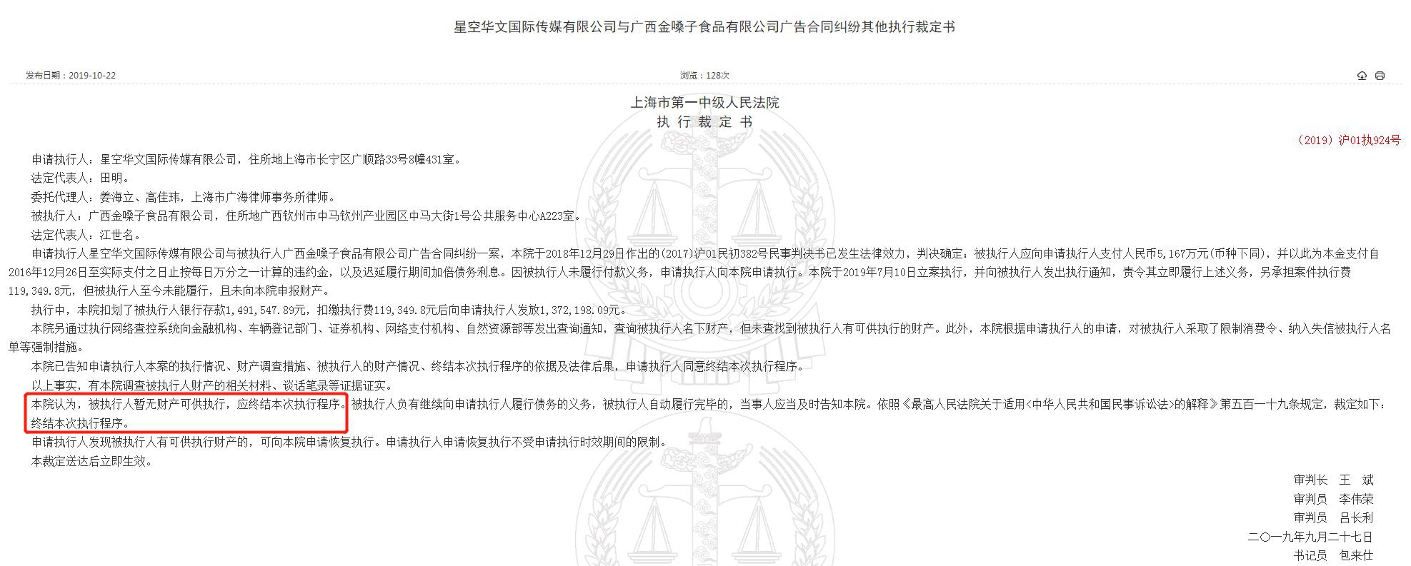 据中国裁判文书网,2019年10月22日,上海一中院公布的(2019)沪01执924号执行裁定书显示,与广西金嗓子发生纠纷的申请执行人为星空华文国际传媒有限公司(下称“星空华文传媒”),涉及广告合同纠纷。