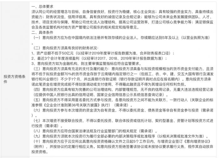 对于投资方,也有一些资格条件,比如:(一)意向投资方应为在中国境内依法注册并有效存续的企业法人,存续期应达到5年及以上(以营业执照为准)。(二)意向投资方须具有良好的财务状况:1、资产总额不低于50亿元(以经审计2019年度审计报告数据为准,合并财务报表口径);2、最近3个会计年度连续盈利(以经审计2017、2018、2019年审计报告数据为准);3、意向投资方如为金融机构,则主要审慎监管指标应符合监管要求。