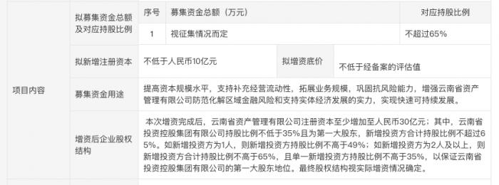 具体来说,本次增资完成后,云南资产注册资本至少增加至人民币30亿元;其中,云投集团持股比例不低于35%且为第一大股东,新增投资方合计持股比例不超过65%。
