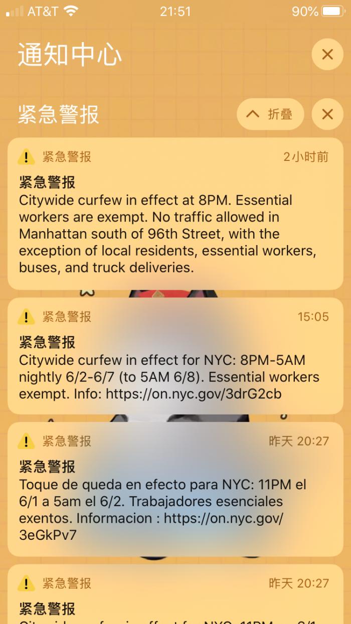 我怀着不安的心情查看了手机,看到的警报是:从6月2日晚开始,纽约市执行宵禁,时间为晚上8点至早上5点,直至6月7日结束。