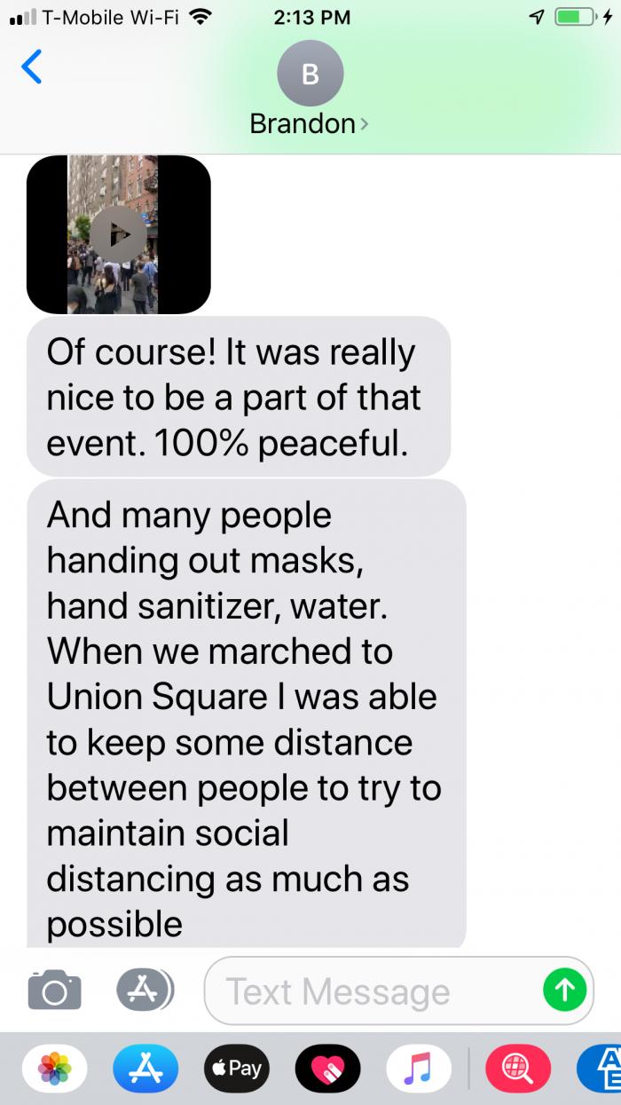 “能够参加这场示威活动真的很棒。这是100%和平的。”Brandon告诉我,许多人都有口罩、杀菌剂和水,“当我们游行到联合广场时,我还可以在人群中和他人保持距离,试图尽可能地维持社交距离。”