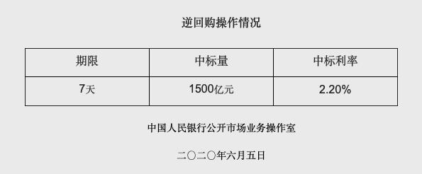 6月1日至6月3日,央行表示,目前银行体系流动性总量处于合理充裕水平,不开展逆回购操作。6月4日,央行称,为对冲公开市场逆回购到期和政府债券发行缴款等因素的影响,维护银行体系流动性合理充裕,2020年6月4日人民银行以利率招标方式开展了700亿元逆回购操作。