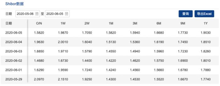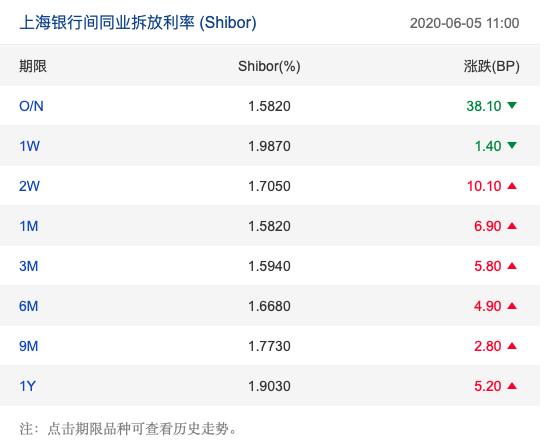 与此同时,中国货币网显示,6月5日,隔夜Shibor(上海银行间同业拆放利率)报1.5820%,下跌38.10个基点。