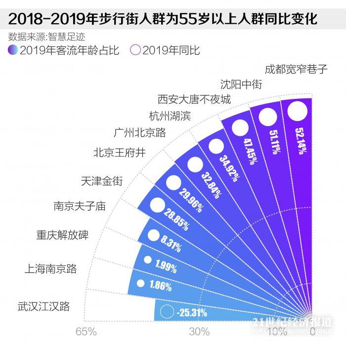值得注意的是,报告发现,11条步行街中,2018-2019年同比客流增幅最快的年龄段为55岁以上的银发一族,平均增幅达24%;西安大唐不夜城增速达到47.5%,排名第三,证明这里也对如王先生一样的银发族产生较高的吸引力,报告由此也认为,银发一族的潜在市场需求巨大,步行街的进一步完善优化可着重挖掘银发一族的消费需求。