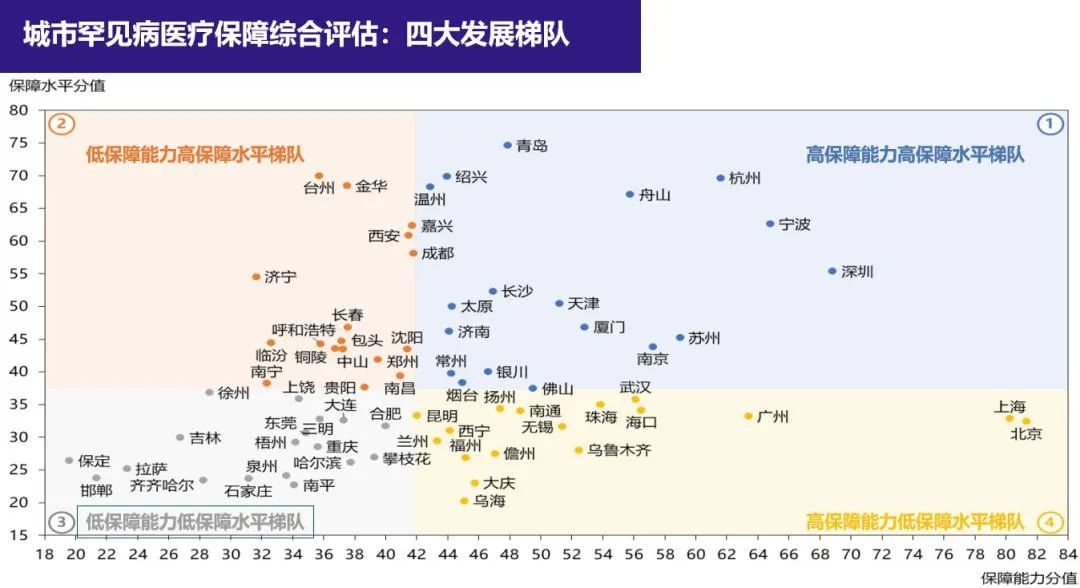按照“硬实力”(罕见病保障能力)和“软实力”(罕见病保障水平)两大维度,报告将70个城市分为“高保障能力高保障水平”“低保障能力高保障水平”“低保障能力低保障水平”“高保障能力低保障水平”等四大梯队。