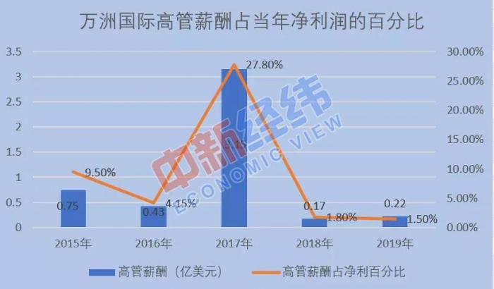 年报数据显示,从2015年至2019年,万洲国际分别实现净利润7.86亿美元、10.36亿美元、11.33亿美元、9.43亿美元和14.65亿美元。而高管薪酬的总费用分别为7500万美元、4300万美元、3.15亿美元、1700万美元和2200万美元,用于支付高管薪酬的费用分别占到当年公司净利润9.5%、4.15%、27.8%、1.8%和1.5%。
