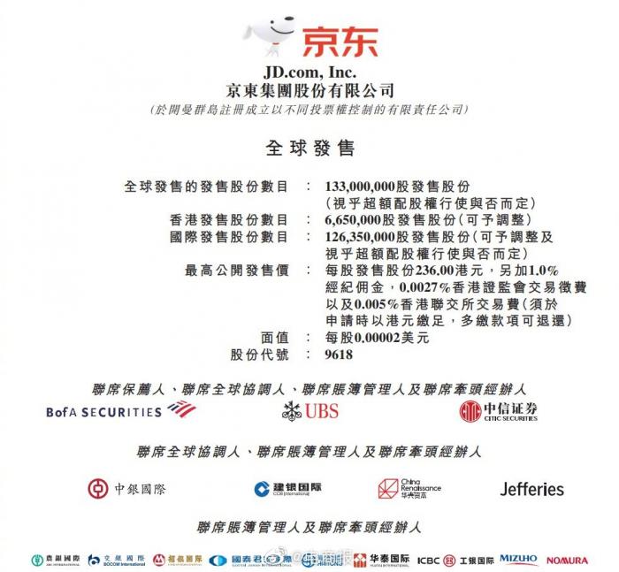 6月8日,京东集团在港交所公告,宣布最高公开发售价为236港元/股,将发行1.33亿股发售股份,股票代号为9618。预期6月11日定价,6月18日在香港联交所交易。