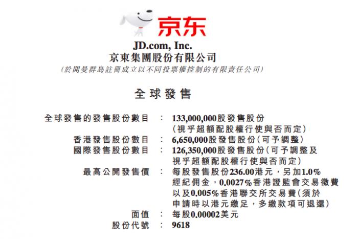 此外,本次京东最高公开发售价为236港元/股,面值为每股0.00002美元。
