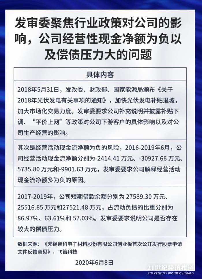 首先是行业政策对公司的影响,2016-2018年,帝科股份的营业收入100%来自晶硅太阳能电池正面银浆,公司经营状况与光伏行业密切相关。2018年5月31日,发改委、财政部、国家能源局颁布《关于2018年光伏发电有关事项的通知》,加快光伏发电补贴退坡,加大市场化交易力度。发审委要求公司补充说明并披露补贴下调、平价上网等政策对公司下游客户的具体影响以及对公司生产经营的影响。