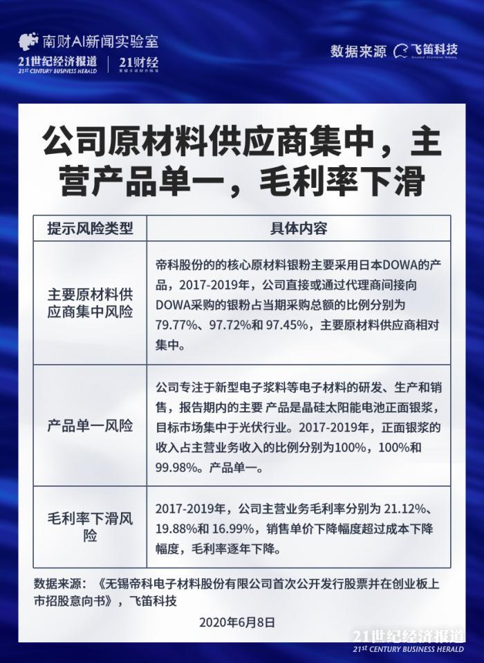 首先是主要原材料供应商集中风险,帝科股份的主要原材料为银粉、玻璃氧化物、有机树脂和有机溶剂等,其中银粉在原材料成本中的占比超过 95%,为公司的核心原材料。公司主要采用日本DOWA的银粉,2017-2019年,公司直接或通过代理商间接向DOWA采购的银粉占当期采购总额的比例分别为79.77%、97.72%和 97.45%,主要原材料供应商相对集中。