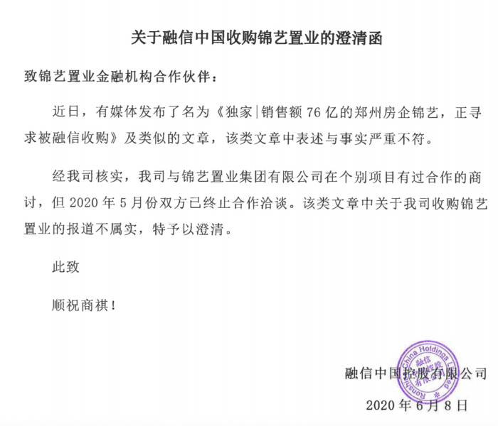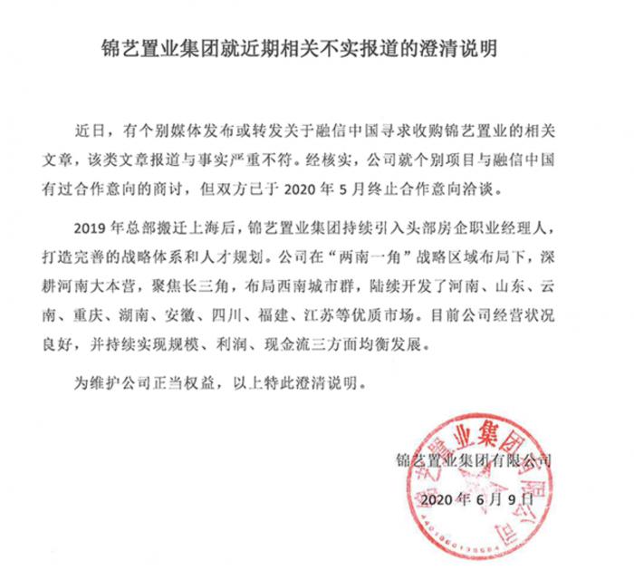 6月8日,针对业内传闻锦艺置业(简称“锦艺”)正与融信(3301.HK)洽谈被收购事宜,融信给锦艺置业金融机构合作伙伴方发了一份澄清函,声明融信与锦艺置业在个别项目有过合作探讨,但2020年5月份双方已终止合作洽谈。6月9日,锦艺置业也在官网发出一份声明,澄清双方已于2020年5月终止合作意向洽谈。