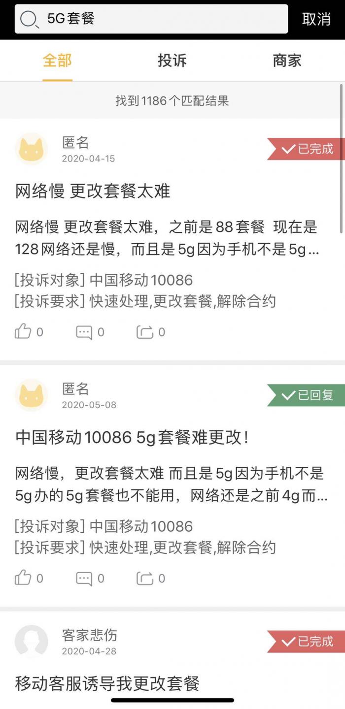 21世纪经济报道记者查询黑猫投诉平台发现,类似的情况不是孤例,在该平台上以“5G套餐”为关键词搜索,可以看到上千条相关投诉。