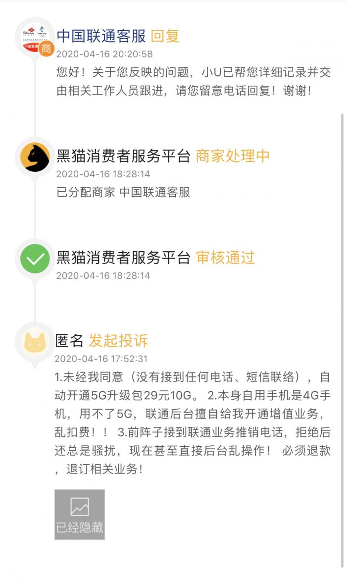 今年4月16日,一名匿名网友发帖称,中国联通在为未经同意(没有接到任何电话、短信)的情况下,为其开通了29元的5G流量升级包,内含10G数据流量。该网友写道:“我使用的是4G手机,用不了5G流量,联通这一行为属于乱扣费。”