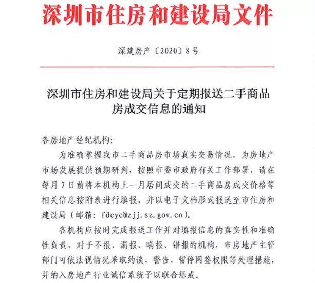 近日,深圳市住房和建设局再发通知,为了准确掌握深圳二手房市场真实交易情况,为房地产市场发展提供预期研判,要求各房地产经纪机构每月7日前上报上一月二手商品房成交价格等相关信息。