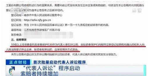 南京中院负责该批案件的工作人员告诉记者,该批案件采用代表人诉讼审理方式,也就是说在人数众多的情况下,每个案件可推选2-5名代表人来打官司,相比每个投资者单案单审,能节约原告投资者大量时间精力方面的诉讼成本,符合公告内显示的投资时间区间的受损投资者,只要在征集期内向法院登记,就可以参与诉讼。