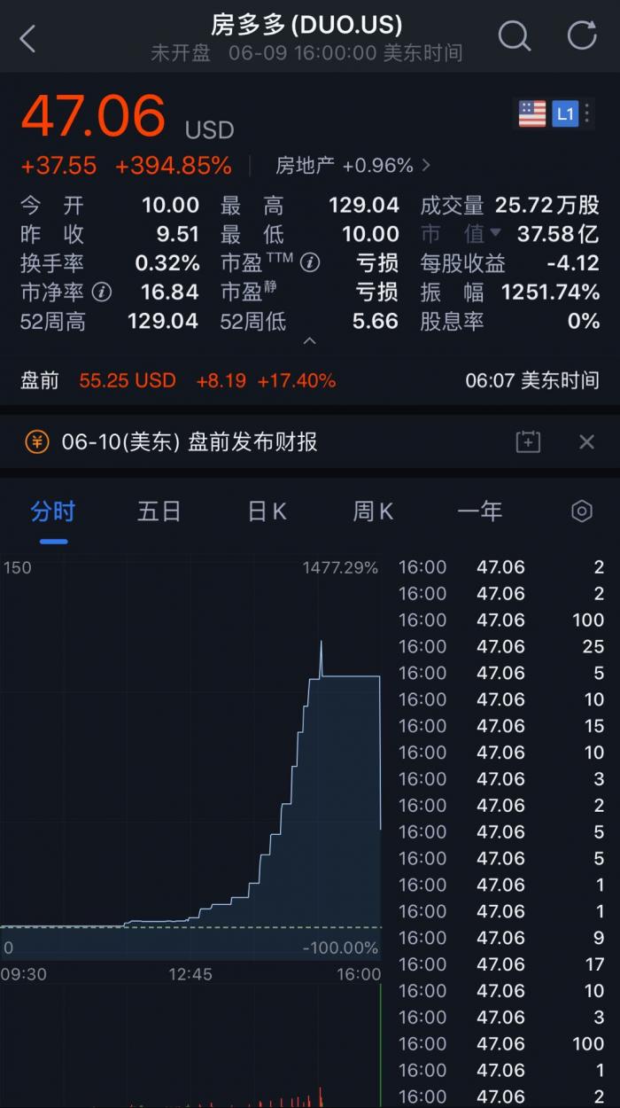 6月10日,房多多美股盘前持续上涨,一度涨近200%,一季度活跃商户规模同比增长43%,创历史新高。隔夜股价一度暴涨逾1200%,触发熔断14次,最终收涨395%。