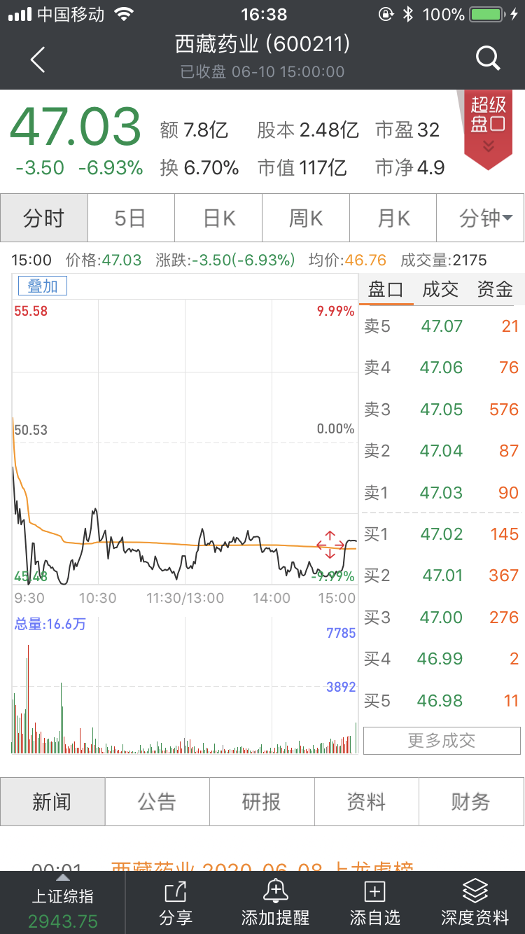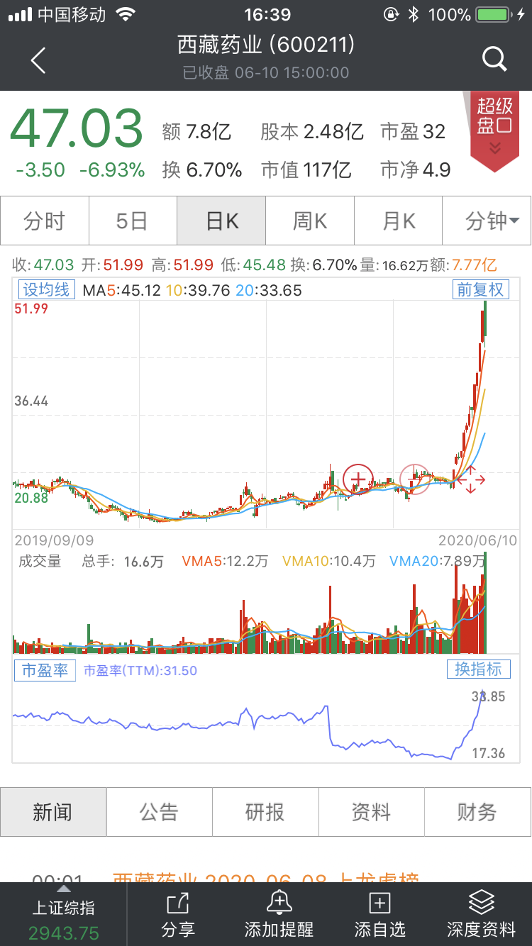 连续两个涨停板的西藏药业今日偃旗息鼓,股价下跌6.93%,股价收于47.03元/股。