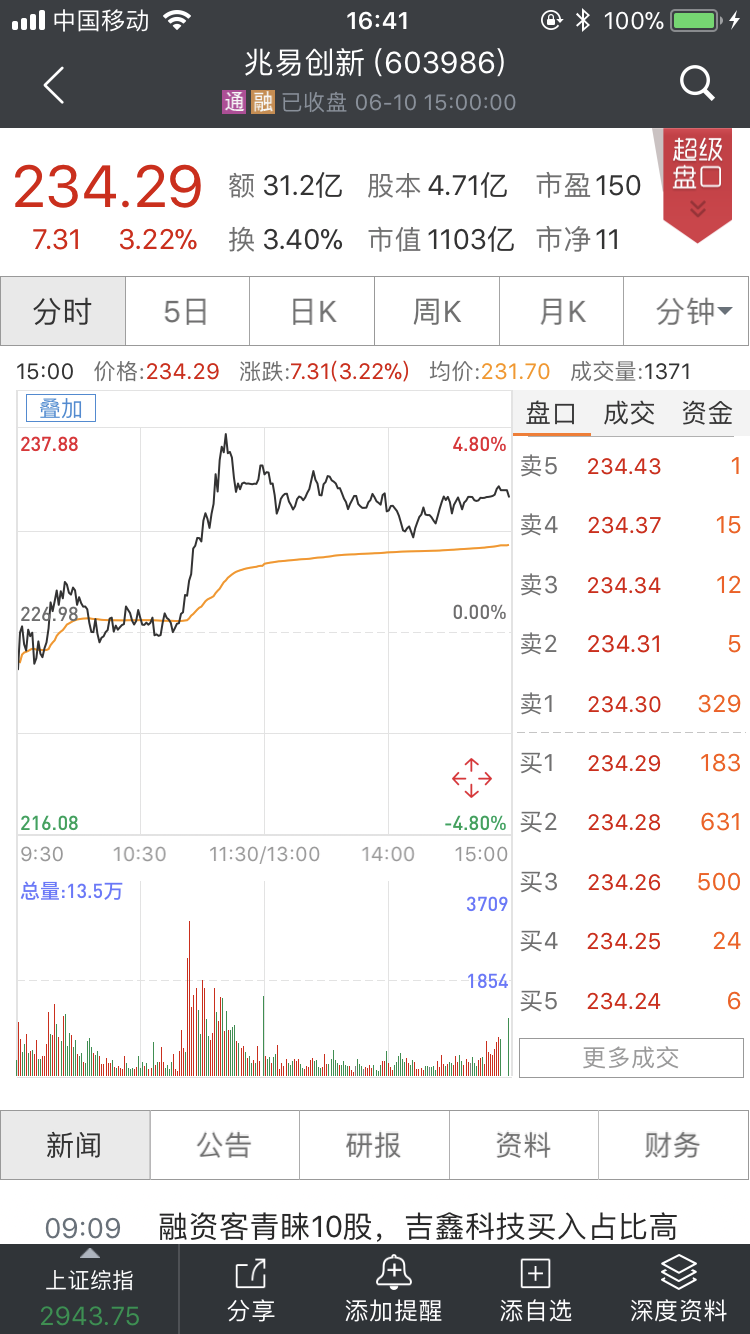 6月9日,兆易创新股价报收234.29元,葛卫东持仓市值高达49.4亿元。