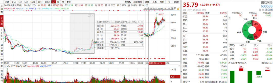 再来看股价,2017年三季度至2018年一季度,用友网络迎来一波上涨,期间均价约为28.36元/股,如果进行前复权,这一段时间的均价为12.6元/股。