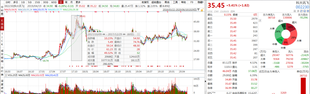 2017年第四季度,科大讯飞一直高位运行,期间甚至创下历史高点。现在,科大讯飞的股价依然低于彼时高位。