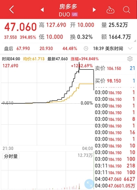 中国在线房产交易服务平台房多多(NASDAQ:DUO) 股价周二盘中一度涨1256.89%,14次触发熔断。在尾盘接近一个小时的暂停交易后,房多多打开熔断,股价瞬间跳水,截至收盘股价报47.06美元,市值达1.5亿美元,涨幅394.85%,创下去年11月份上市以来最大单日涨幅及股价收盘新高,股价已较上市首日收盘价上涨逾260%。