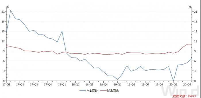 今年前几个月就是这样的情形:疫情影响下,企业对资金断裂的担忧增加、部分企业通过发债融资购买结构性存款套利,M2增速较高,但M1增速较低。