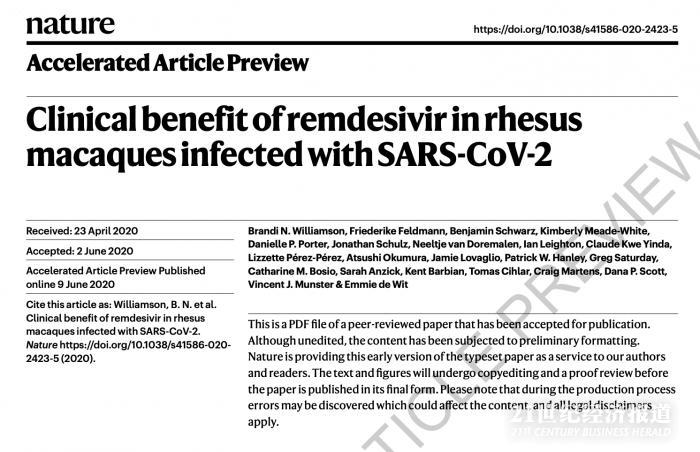 6月9日,学术顶刊《Nature》在线发表题为“Clinical benefit of remdesivir in rhesus macaques infected with SARS-CoV-2”的研究论文,其结果指出在感染了新冠病毒(SARS-CoV-2)的恒河猴中,早期使用瑞德西韦治疗有明显的临床益处。