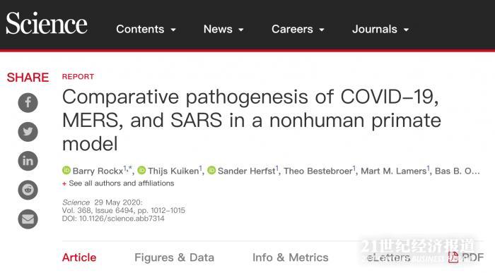 除了上述发表在《Nature》的研究结果,《Science》在5月29日也发表了一篇题为“Comparative pathogenesis of COVID-19, MERS, and SARS in a nonhuman primate model”,论证新冠病毒在非人类灵长类动物模型中的发病机理。
