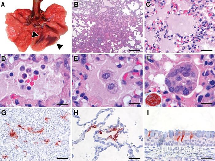 接种SARS-CoV-2的食蟹猕猴的肺部特征性病理变化和病毒抗原表达(图源:《Science》)