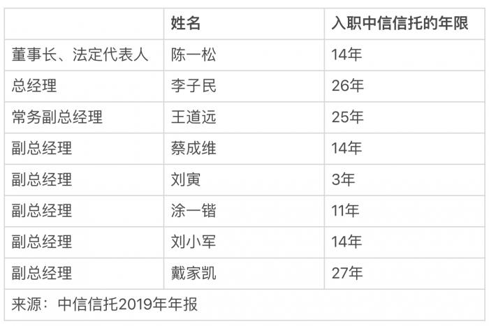 中信信托的领导班子在业内属于较为稳固(如下图),上一任董事长蒲坚,亦是在中信信托工作了近10年时间后,被调任中信集团任副总经理。