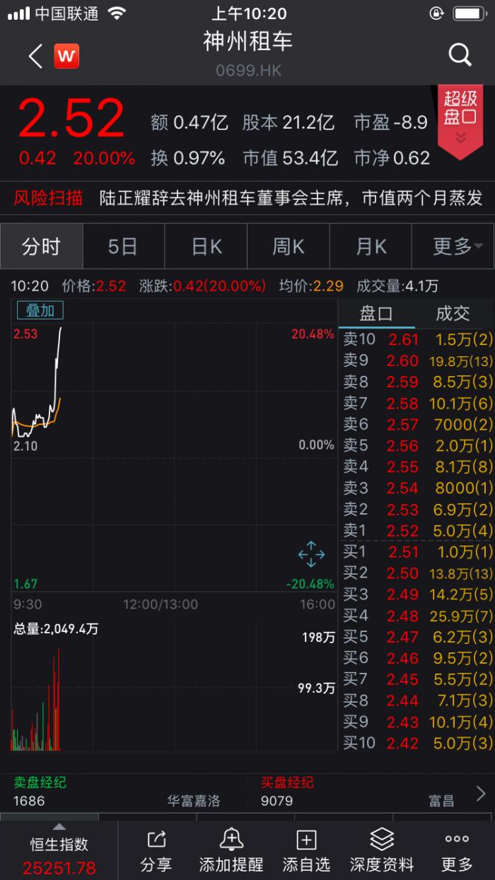 6月10日早盘,截至10:20,港股神州租车(0699.HK)涨超20%。