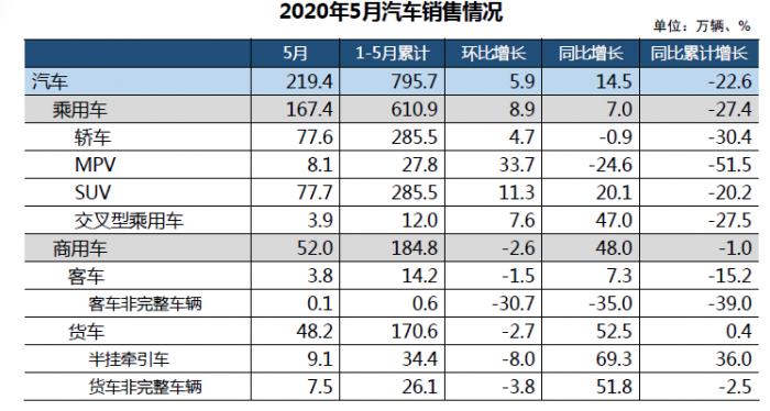 “从产销量同比来看,5月汽车产销呈现两位数增长。乘用车产销增速由负转正,其中SUV产销继续保持正增长,交叉型乘用车受就业拉动呈现大幅增长;商用车在货车拉动下,继续呈现大幅增长,货车中四类车型均增长迅猛,其中重型货车和轻型货车均刷新了5月份销量的历史新高。”中汽协副秘书长陈士华表示。