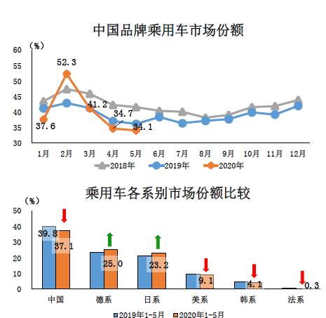 中国品牌乘用车继续下降。今年5月,中国品牌乘用车销量为57.1万辆,同比仅增长0.4%,回暖速度低于市场整体水平,市场份额较去年同期下降2.2个百分点,仅为34.1%。前5月,中国品牌销量为226.4万辆,同比下降32.5%,市场份额仅为37.1%,同比下降2.8个百分点。