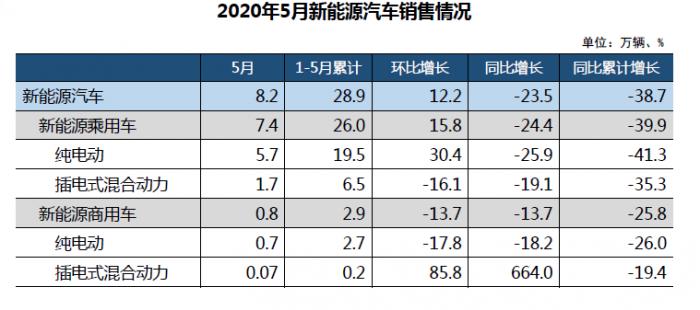 不过,新能源汽车市场仍处于低位。今年5月,新能源汽车产销分别完成8.4万辆和8.2万辆,同比下降25.8%和23.5%。前5月,新能源汽车产销分别为29.5万辆和28.9万辆,同比分别下降39.7%和38.7%。