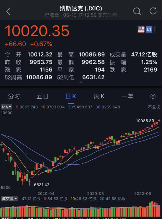纳指收盘首次站上万点大关 中概股掀熔断潮