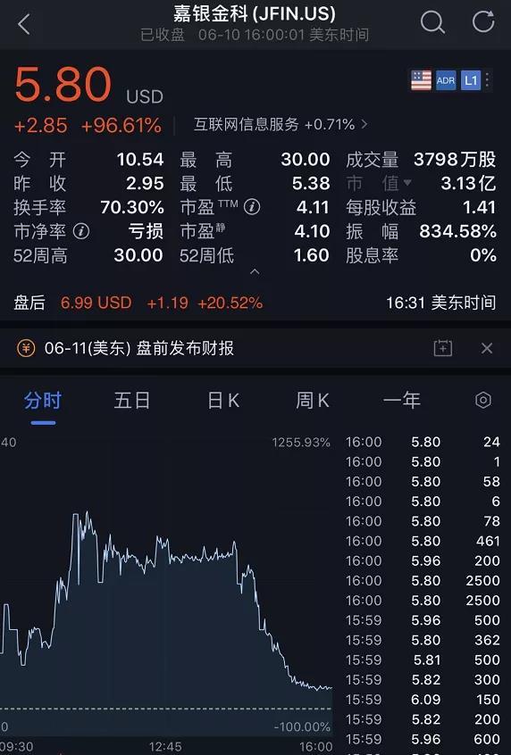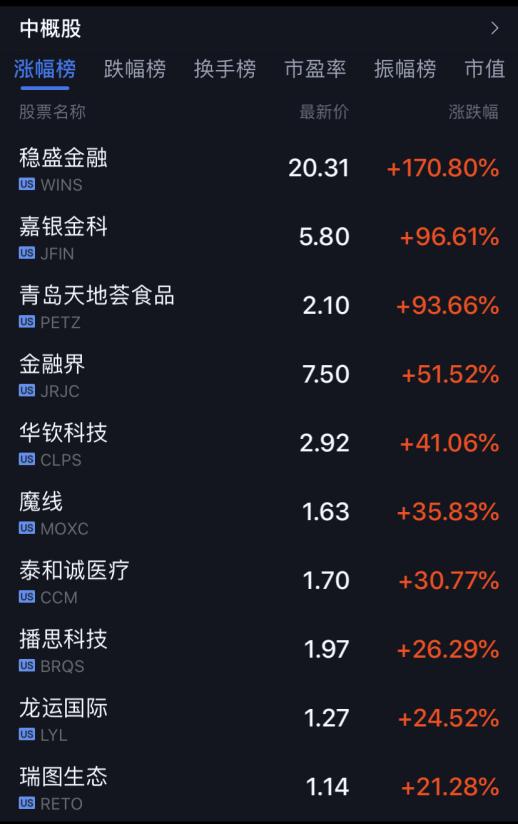 多家中概股盘中再次出现了熔断式的上涨,嘉银金科、稳盛金融、金融界集体熔断,嘉银金科一度暴涨10倍,换手率达到100%,但收盘时涨幅均出现大幅回落。截至收盘,稳盛金融上涨170.8%,嘉银金科、青岛天地荟涨幅超过90%,金融界涨幅超过50%。