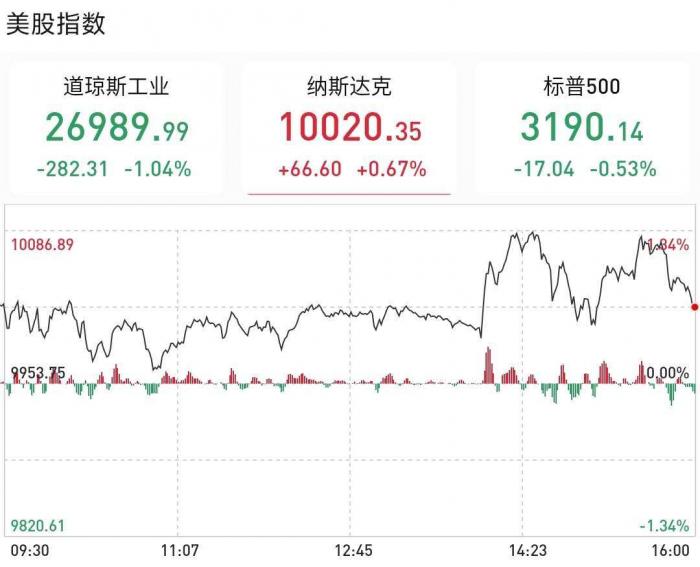 美股三大指数周三表现分化。道琼斯指数收报26989.99点,下跌282.31点,下跌1.04%;标普500指数收报3190.14点,下跌17.04点,跌幅0.53%;纳斯达克收盘首次站上万点大关,报收10020.35点,上涨66.60点,上涨0.67%。