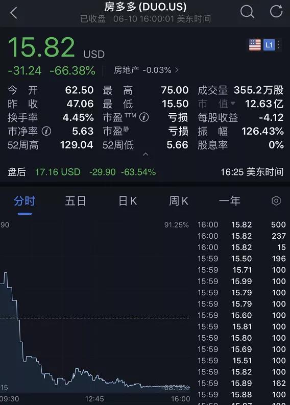 前一交易日涨幅高达394%的房多多盘前涨幅一度达到100%,但开盘后开始放量下跌,收盘下跌66.38%,股价已经跌回飙升前水平。值得注意的是,房多多最新公布的财报并未出现惊喜:公司一季度营收2.72亿元,同比下降58.5%;归母净利润亏损1.36亿元,去年同期亏损5143.9万元。公司预计二季度营收在6.6-7.2亿元之间。