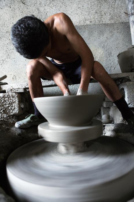将泥土直接捏成具有优美弧线的器形,是很不容易的。但用转动的车盘来拉坯,会使得制作圆形的、匀称的器形变得简单一些。不过这仍然需要长久的经验和训练。“要7年以上,跟着师傅,天天做,才能成为熟手。”